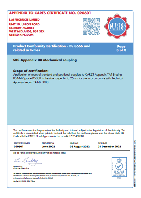 We are pleased to announce that we have recently successfully achieved CARES approval to produce Recostal Threaded Coupler Bars.